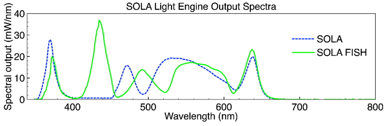 - Lumencor light engine Generation I: Sola SE 6-LCR-SB (see blue curve below)