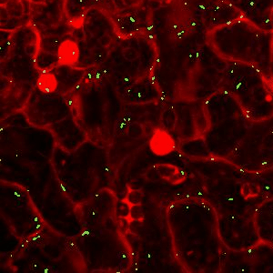 Motile Agrobacterium with a protein transgenically modified to express GFP tagged VirE2, used as a reporter to visualize the effects of plant hormones on intracellular protein trafficking in tobacco plants. Sample preparation and imaging: Rohan Shetty; principal investigator: Assoc Prof Pan Shen Quan.