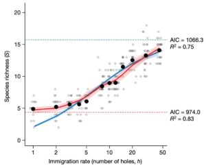 The relationship between species richness and immigration rate in the experiment exhibited a low floor at low immigration rates, consistent with the novel theory (red), rather than a high ceiling at high immigration rates, as predicted by the classic theory (blue).