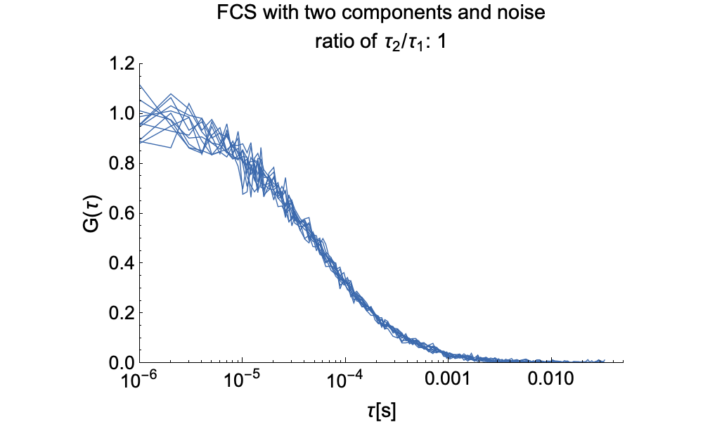 Theoretical FCS functions for two diffusive components in 3D with added noise. The first diffusion time si fixed at τ1 = 50 μs. The second component, τ2, varies from 50 μs to 4.8 ms. Each graph shows 11 correlation functions depicting the cases for mole fractions of the second component, f2, from 0-1 in steps of 0.1.