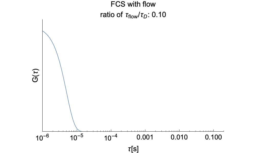 2D ACF for diffusion and flow. The diffusion time is τD = 50 μs. The flow time of the particle though the observation area varies between τflow = 10 μs to 1 ms. The form of the ACF will be more diffusion like or flow like (steeper) depending on which time dominates.