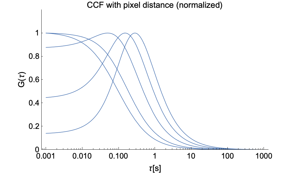 A further advantage of imaging FCS is that we can now also measure spatial cross-correlations between pixels. In the graphs below we depict raw ACFs on the left and (peak-) normalized ACFs on the right for pixels of different distance. This demonstrates that the number of particles diffusing from one pixel to another decreases with distance and thus the ACF drops. Although the pixels individually see the same number of particles, a smaller and smaller fraction is correlated between pixlels when the distance between them increases. The right side shows that the cross-correlation peak moves to longer time with inter-pixel distance as particles need longer to diffuse from one pixel to the other.