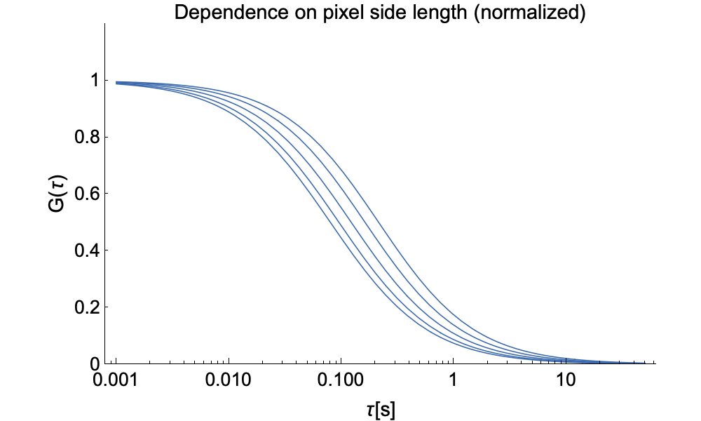On cameras we acquire an array of contiguous pixels. This allows measuring many ACFs simultaneously, but also to bin pixels for the measurment of FCS diffusion laws, improve signal to noise ratio, or extend the time a particle spends in the observation volume to capture more features of the ACFs. The images below show how the ACF in ITIR-FCS changes with pixel size. On the left one can see how the amplitude decreases with pixel size as more particles are recorded. On the right we have normalized the same functions to show how the width increases with pixel size as particles need more time to cross the observation volume.