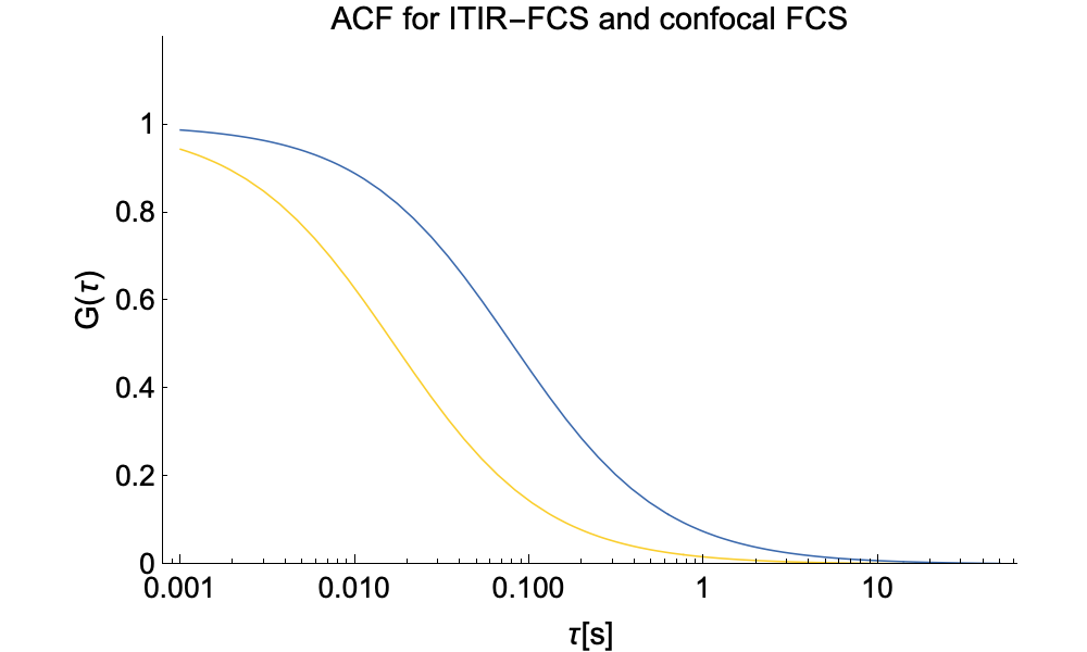 In the graph on the top above one can see the subtle differences in the shape of the ACFs for confocal (yellow) and ITIR-FCS (blue). On the bottom graph we show ACFs for confocal and ITIR-FCS with typical setup parameters for each technique. The ITIR-FCS curve is wider, although it measures the same particle with the same diffusion coefficient, as the observation volume in imaging FCS tends to be larger. Also note that in imaging FCS, the diffusion coefficient D is directly uesd as a fit parameter as the pixel size is exactly known, the intensity is conatnt in the focal plane, and the PSF for an optical system is easily measured. This has the advantage that in imaging FCS no extra calibrations are needed once the PSF of the optical system has been determined.
