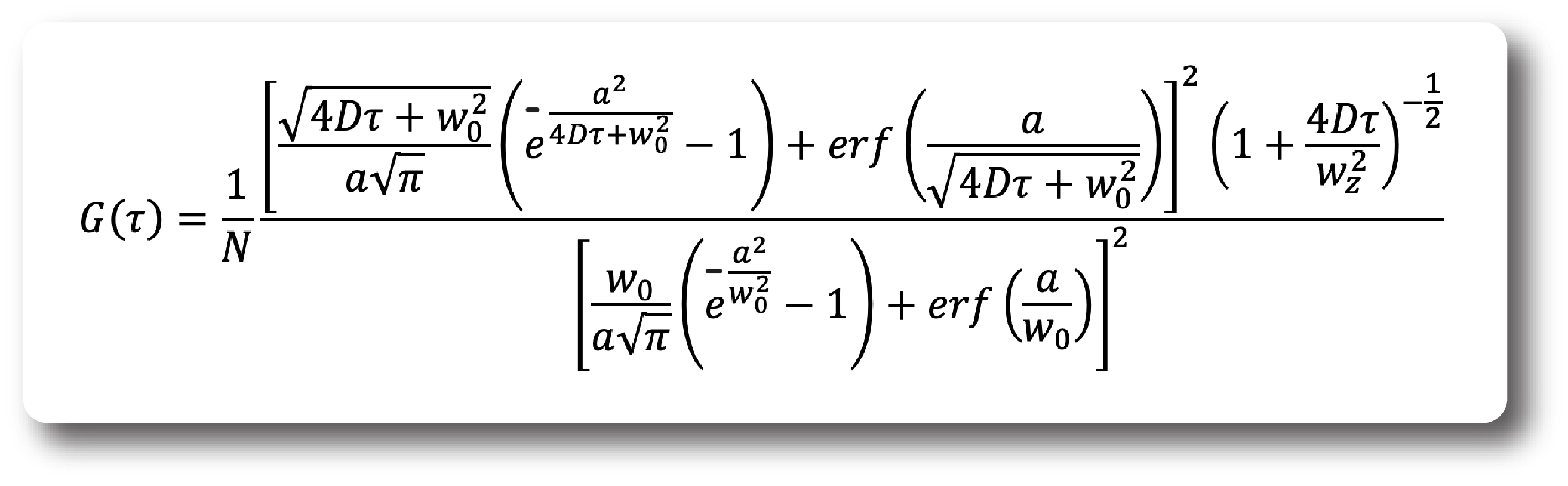 This is only an approximation as it disregards the fact that the actual intensity in lateral direction (perpendicualr to the optical axis of the detection objective) is constant and thus in reality leads to cross-talk, that reduces the amplitude and increases the width of the ACF. This can lead to underestimations of the diffusion coefficient on the order of 30% in our setups. However, this is especially visible in CCFs where the cross-talk contribution at short times is larger than would be expected from the equation above.