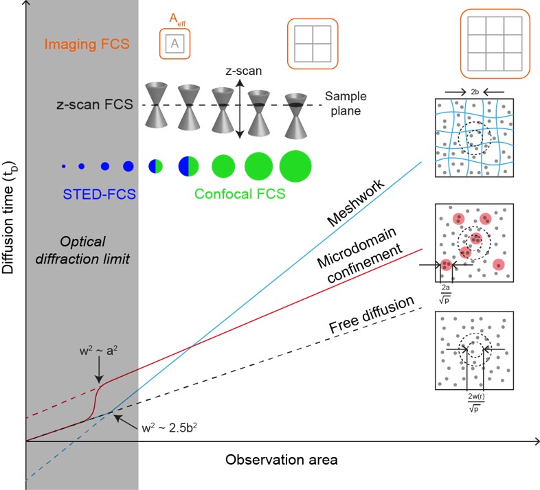 FCS diffusion law plots for various diffusion modes in the membrane: free diffusion (black dotted line), hindered diffusion in microdomain confinement (red line) and hop diffusion in meshwork compartmentalization (light blue line). Range of spatial resolutions of the observation areas (in scale) for each experimental variation: STED-FCS (dark blue circles), confocal FCS (green circles), z-scan FCS and Imaging FCS (orange squares) are shown. (This figure is adapted from the one in Ref. [10]). Our recent publication has characterized the FCS diffusion law in the presence of multiple diffusive modes [11].