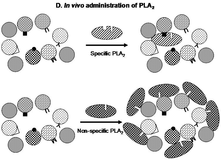 • Target model – Although a variety of pharmacological effects are induced by PLA2 enzymes, not all the effects are exhibited by all PLA2 enzymes. Each enzyme exhibits a specific effect. To explain the susceptibility of a tissue to a particular PLA2 enzyme, we proposed the presence of specific "target sites" on the surface of target cells or tissues. These target sites are recognized by specific "pharmacological sites" on the PLA2 molecule. These pharmacological sites are independent of, but sometimes overlapping with, the active site of the enzyme. The target sites and pharmacological sites are complementary to each other in terms of charges, hydrophobicity and van der Waal's contact surfaces. High affinity between the target and pharmacological sites determines the specific pharmacological effects of PLA2 enzymes. The proposed target sites could be either membrane lipids or proteins (glycoproteins). Therefore according to the target model, high affinity protein-protein interaction between PLA2 and membrane protein in the specific target tissue determines the specific pharmacological effects of PLA2 enzymes. We and others have shown that anticoagulant PLAenzymes bind to blood coagulation factor Xa to exhibit their function (Anticoagulant phospholipase A2enzymes).