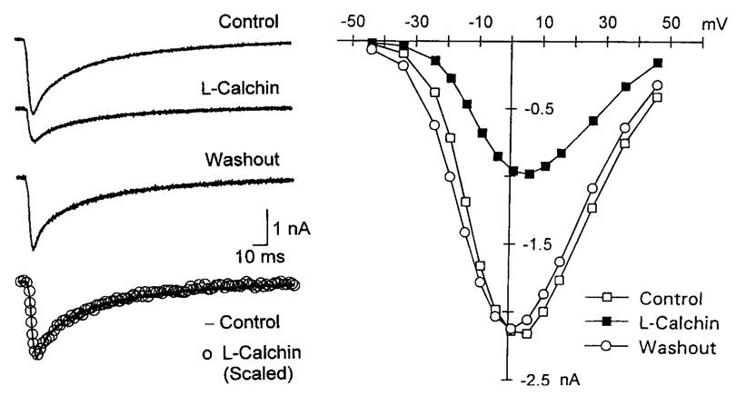 of L-type calcium channel isolated from mamba snake venom. By systematic comparison of the sequences of three-finger toxins from mamba venoms and using proline brackets theory (Protein - protein interaction sites), we identified the functional site of this and other L-type calcium c hannel blockers. The synthetic peptide, L-calchin, shows negative inotropic effects in isolated rat hearts similar to parent protein. It also blocks the L-type calcium current in rabbit cardiac myocytes as shown by patch clamp experiments. This block is voltage-independent. Thus, the 8-residue peptide behaves similar to the parent molecule.