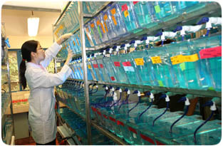 A small seawater facility in the department holds aquariums which are used for the study of hatchery technology, feed development, spawning and rearing of marine fish. For larger running seawater aquariums, we have access to the facilities of the Tropical Marine Science Institute (TMSI) on St John’s island. These state-of-the-art laboratories were opened in 2001 to support research in marine science, environmental science and aquaculture and as such provide scientists with all the required marine habitats and aquaria. DBS enjoys close collaboration with TMSI, so extending the possibilities at NUS for multidisciplinary marine research.